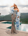 Adding to the fantasy, a voluminous blue organza stole drapes around the arms, featuring soft ombre ruffles and delicate floral appliqués, enhancing the gown’s dreamy, sky-like essence. The combination of textural contrast, from shimmering crystals to feathery chiffon, gives the look depth and dimension.