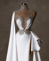 Furthermore, adding a contemporary flair, a side cape flows from the shoulder to the floor, crafted from the same pristine white satin. This flowing detail not only adds a touch of drama but also captures the essence of modern romance. An alluring deep slit on the opposite side adds a hint of allure and movement. Moreover, it allows the bride to showcase her individuality with every step.
