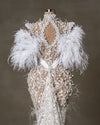 Furthermore, with a high neckline, the dress exudes a regal aura, framing the bride's face with refinement. A daring cutout in the chest adds a touch of allure and modernity, striking a perfect balance between tradition and contemporary design. Short sleeves, crafted from the same ethereal feathers, add a touch of whimsy and playfulness to this celestial creation.