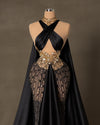 The Black Dress is completed with a front tail crafted from luxurious black satin, enhancing its elegance. This addition brings a sense of fluidity and sophistication to the overall design. This Black Dress features gold stone embellishments and front tail, creating a harmonious symphony of textures and details. Furthermore, it guarantees to make a lasting impression at any special event or occasion.