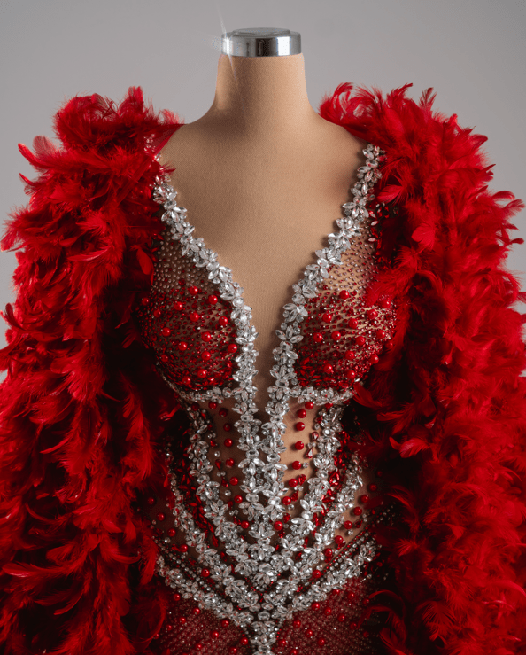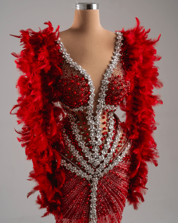 The cut-out details at the waist add an element of daring elegance, sculpting the body and emphasizing an hourglass shape. The long, beaded fringe at the bottom adds movement, ensuring the dress dazzles with every step. Surrounding the gown is a luxurious red feather boa, draped effortlessly over the shoulders, adding a theatrical and opulent touch reminiscent of old Hollywood glamour.