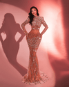 This mesmerizing gown is the epitome of sophisticated glamour, combining impeccable craftsmanship with a radiant, jewel-like finish. Designed to sculpt and celebrate the silhouette, the dress features a sleek long-sleeve bodice adorned with countless crystal appliqués that shimmer like molten light. The high neckline adds a touch of refined elegance, while the strategic illusion detailing at the waist creates a breathtaking hourglass effect.