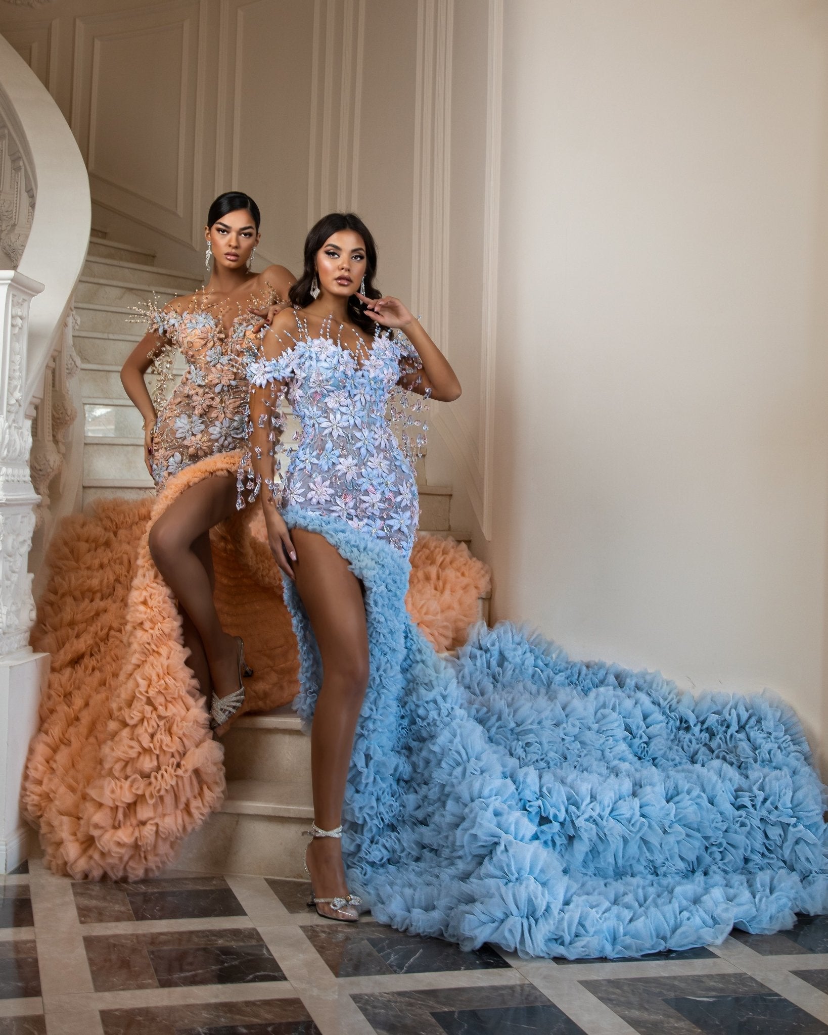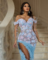 This long off-shoulder dress in a light blue color is a true masterpiece of haute couture fashion. The dress is embellished with delicate released crystals that sparkle and shine, creating a truly glamorous look. The dress is created with a beautiful flowers lace which adds a touch of romance and femininity to the design. The dress features a deep slit that adds a touch of allure and sensuality, while the majestic tail of layered tulle adds a touch of drama and elegance.