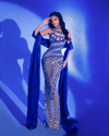 The lower half of the gown extends into a mesmerizing cascade of ornamental beadwork, forming captivating, almost celestial motifs that highlight the wearer’s silhouette. The rich sapphire-blue tones contrast strikingly against the sheer base, giving the gown its powerful, luminous presence.