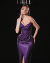 Made from a shimmering metallic fabric, this gown catches the light with every movement, delivering a subtle sparkle that elevates its glamorous appeal. The rich purple hue exudes elegance and individuality, making it a standout choice for those who want to be unforgettable. A sleek front slit adds a bold yet refined element, allowing graceful movement while showcasing a hint of leg.