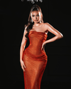 Command attention with this striking strapless evening gown, designed to radiate confidence, glamour, and timeless sophistication. Made from a shimmering metallic fabric, this dress glows with a rich fiery red-orange hue that captures light beautifully, ensuring all eyes are on you the moment you enter the room.