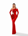 Turn heads in this breathtaking red evening gown designed to exude elegance and sophistication. This one-shoulder silhouette features a stunning asymmetrical neckline that highlights the décolletage, paired with long fitted sleeves for a sleek finish. The dress is crafted from a luxurious satin-like fabric that hugs the body and flares slightly at the hem for a classic mermaid silhouette. Intricate crystal embellishments on the shoulder and waist create a dazzling focal point, adding a touch of glamorous sparkle. Perfect for formal events, red carpet occasions, or any night that calls for unforgettable style.