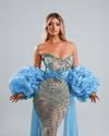 The true showstopper is the voluminous organza off-shoulder sleeves—a cloud-like detail that adds softness and grandeur. Paired with a structured blue satin belt cinched at the waist, the gown effortlessly balances drama and grace. Flowing from the waist are two sheer side capes, gliding with movement and creating an enchanting, almost celestial effect as they trail behind.