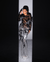 What truly elevates this look is the dramatic crystal-embellished skirt, cascading down in a shimmering waterfall of sparkling chains that catch the light from every angle. Adorned with delicate feather accents, the dress brings a whimsical texture that contrasts beautifully with the sharp glint of the crystals. The floor-length silhouette elongates the figure, while the fitted shape embraces every curve with grace.