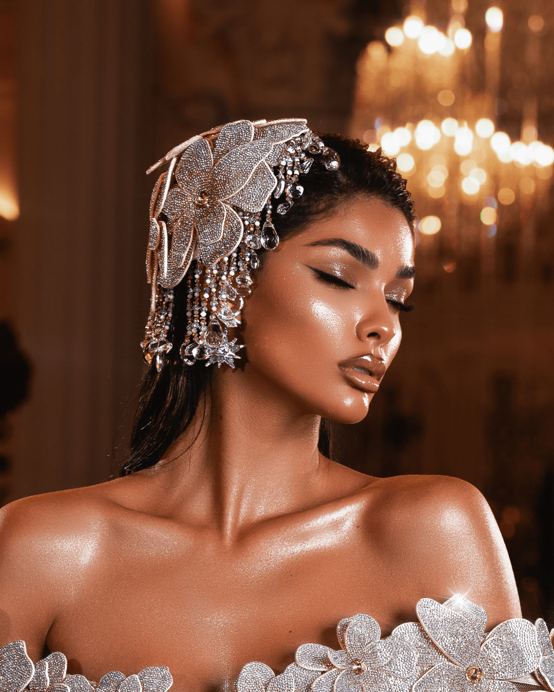 The gown’s most striking feature is its voluminous sculpted skirt, crafted from luxurious pleated fabric that cascades into dramatic, cloud-like folds. Adorned with silver floral motifs and subtle sparkle, the design captures both movement and elegance, making it a true showstopper. Every curve, shimmer, and petal reflects an unwavering dedication to couture craftsmanship and artistic vision.