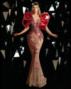 The daring design features just one sleeve, adding a touch of intrigue and modernity to the classic silhouette. Adorned with a symphony of red and green crystals, each meticulously placed, the dress glistens like stars against the rich red backdrop, exuding an aura of regal opulence.