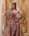Adding to its allure, a detachable overskirt cascades gracefully from the waist, creating a captivating aura of grandeur. Crafted from the same sumptuous fabric and adorned with matching beadwork, the overskirt flows elegantly to the floor, imbuing each step with a sense of majestic splendor.