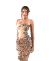 Adorned with three-dimensional floral appliqués, delicate beadwork, and metallic embroidery, this gown glimmers with every movement. The intricate embellishments cascade gracefully down the body, blending champagne hues, bronze undertones, and crystal accents that evoke a sense of luxury and depth. The asymmetrical floral detailing on the bodice adds a unique artistic touch, while the sleek strapless neckline enhances the décolletage with understated allure.