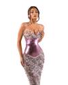 This stunning evening gown is a captivating fusion of modern glamour and classic elegance. The dress features a strapless sweetheart neckline that beautifully enhances the décolletage, while the structured metallic corset in a lustrous pink hue cinches the waist, creating a breathtaking hourglass silhouette. The bodice flows seamlessly into a floor-length mermaid skirt, adorned with iridescent sequins and embellished floral appliqués that shimmer with every movement. The intricate detailing gives the illusion of sculpted scales, evoking a mesmerizing mermaid-inspired aesthetic.