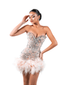 The fitted shape cascades into a flirty, feathered hemline, adding a touch of drama and femininity. The feather trim, in soft blush tones, creates a whimsical contrast to the structured upper half, giving the entire look a high-fashion editorial feel. The combination of textured embellishments and feathered flair offers an opulent yet playful aesthetic, ideal for standout moments at galas, cocktail parties, or fashion-forward events.