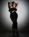 Chic black dress with shimmering lace, maxi-length, waist cut-out, floral chest details, and a stylish twist neckline for a touch of elegance. Check Out Mira's Exclusive Collection!