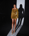 Shine like never before in this gold mirror mini dress from the PREMIERE Collection — a bold celebration of glitz, confidence, and modern extravagance. Crafted to command attention, this dress is fully adorned with reflective gold mosaic tiles arranged in hypnotic, curved patterns that sculpt and highlight the figure.