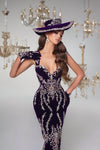 Additionally, to complete the ensemble, a haute couture hat takes center stage. Made from the same luxurious purple velvet fabric and embellished with silver details, the hat adds a touch of drama and high-fashion flair.