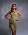 This eye-catching lime green mini dress is a dazzling fusion of bold style and feminine allure. Designed with a body-hugging mesh structure adorned in crystal embellishments, the dress catches the light with every movement, creating a radiant, shimmering effect. The asymmetrical draping at the waist and hip gives it a fashion-forward twist, while the high slit adds just the right amount of drama and allure.