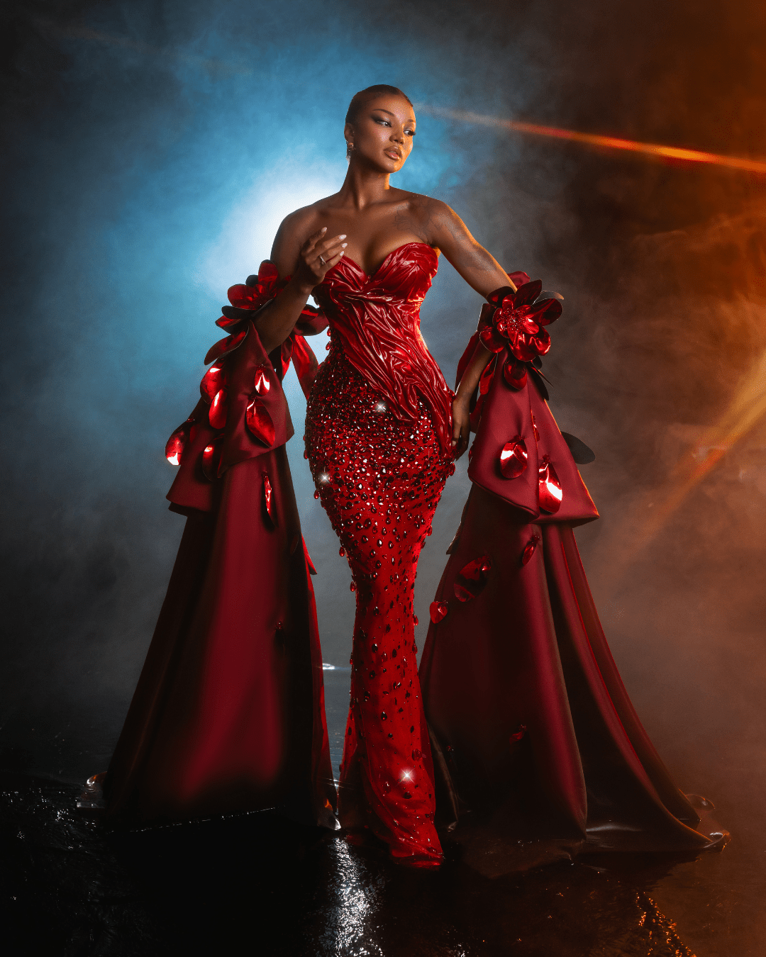 This gown is a celebration of confidence and bold femininity. Whether worn under spotlight or candlelight, it guarantees all eyes on you. The gold hue symbolizes luxury, success, and divine energy, making it the ultimate statement for galas, premieres, or fashion editorials.
