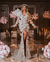 Moreover, as you glide across the floor, delicate leaves adorned with shimmering pearls gracefully flow around the deep slit, creating a mesmerizing aura of enchantment. Furthermore, this Bridal Dress is not just a garment; it's a masterpiece, designed to make you feel like royalty on your special day.
