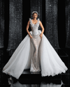 At the waist, the gown transitions into a dramatic overskirt, crafted from layers of ethereal tulle delicately speckled with tiny crystals, creating a celestial glow with every movement. The sheer, beaded underlayer beneath the voluminous overskirt adds an alluring contrast, blending classic bridal beauty with contemporary allure.