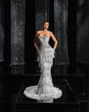 The mermaid-style skirt hugs the body before flaring into a soft, flowing train, enhancing the gown’s regal presence. The silver hue, combined with the sparkling embellishments, gives off an ethereal and celestial vibe, making it perfect for red carpet events, gala evenings, or high-fashion occasions.