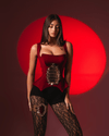This striking fashion look blends dramatic structure with sensual detailing, creating a bold, avant-garde aesthetic. The centerpiece is a deep red corset top crafted with a sculpted, hourglass silhouette that accentuates the waist. Its standout feature is an ornate gold cage embellishment at the front, adding a futuristic, architectural edge to the outfit. The corset’s rich color and sharp contours contrast beautifully with the model’s sleek posture and the warm lighting behind her.