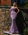 Step into the spotlight with this sensational lavender couture gown, a masterpiece that merges femininity with architectural elegance. Crafted in a soft yet striking shade of pastel purple, the gown is adorned with 3D floral appliqués and shimmering beadwork, creating a garden of texture and sparkle from neckline to hem.