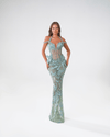 This exquisite couture evening gown is a striking expression of luxury, femininity, and refined craftsmanship. Designed in a soft seafoam blue palette, the dress features a sheer illusion corset bodice that creates a beautifully sculpted silhouette while highlighting elegant structure and detail. The plunging neckline is framed by delicate off-the-shoulder straps, adding a sensual yet sophisticated touch.