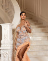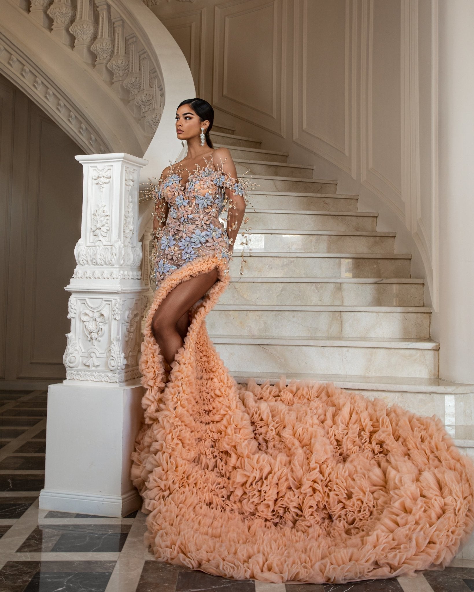 This long dress in a delicate peach color is a true masterpiece of haute couture fashion. The dress features an off-shoulder design that adds a touch of modernity and sophistication, while the color of the dress evokes feelings of softness and femininity. The dress is embellished with delicate released crystals that sparkle and shine, creating a truly glamorous look. The dress is created with a beautiful flowers lace which adds a touch of romance and femininity to the design. The dress features a deep slit that adds a touch of allure and sensuality, while the majestic tail of layered tulle adds a touch of drama and elegance.