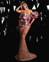 The bodice of the dress features a mesmerizing 3D design crafted from metallic leather in a soft, light pink hue. This intricate detailing adds depth and dimension to the gown, creating a captivating focal point that draws the eye and enhances the overall allure of the dress.