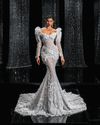 The skirt flows into a mermaid-style silhouette, hugging the curves before flaring into a breathtaking, intricately embroidered train. The delicate lace and beaded detailing throughout resemble frost-kissed petals, making this gown a true embodiment of winter romance and celestial beauty.