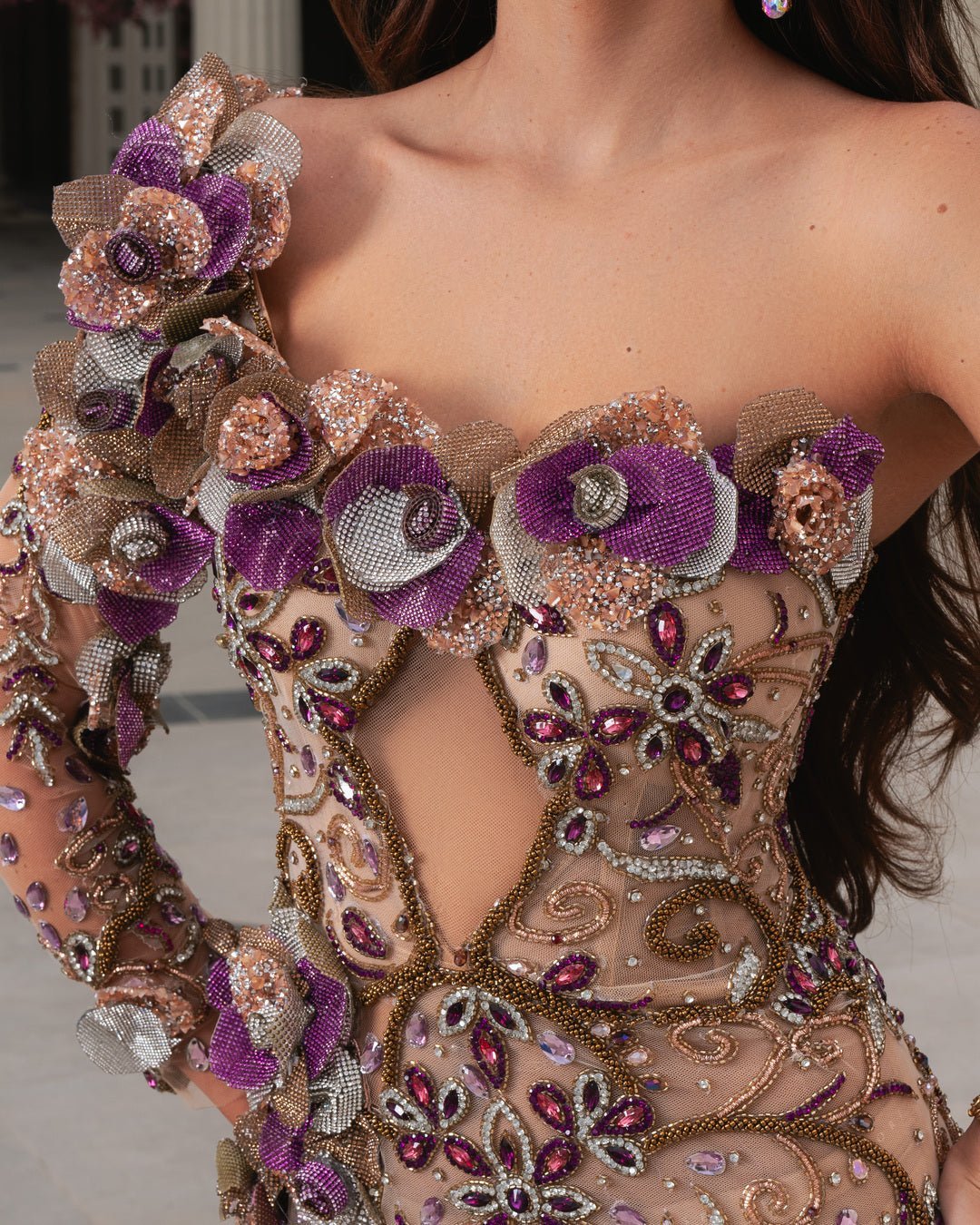Crafted in a subtle mix of nude tones with soft purple accents, the Elisabete Dress strikes the perfect balance between understated sophistication and bold fashion statement. The carefully placed floral patterns enhance the dress’s shape, creating a flattering silhouette that embraces the wearer’s curves. The asymmetry in the design adds drama to the look, making it ideal for formal events where standing out is key.