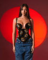 The centerpiece of the corset is its daring plunging neckline, subtly enhanced by a sheer illusion panel that adds sophistication and balance to the bold design. The combination of soft velvet and radiant embellishments creates a beautiful contrast, allowing the detailing to shimmer under any lighting. Perfect for fashion-forward styling, this corset pairs effortlessly with high-waisted jeans, tailored trousers, or even a statement skirt, making it versatile for both editorial looks and nightlife outfits.