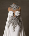 Elegance personified, this stunning Bridal Dress is a vision of timeless beauty. The gown, crafted from lustrous white satin, features a classic, sleeveless silhouette. It gracefully cascades to the floor, creating an air of sophistication and grace. The back of the dress boasts a captivating cape that begins at the shoulders. It gently flows down, adding a touch of ethereal charm to the Bridal Dress.