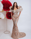 The meticulously placed 3D leaf details on the shoulder provide an unexpected and enchanting twist to the classic off-shoulder silhouette, making this dress a true work of art. Whether you're attending a gala, wedding, or any special occasion, this dress promises to deliver elegance, style, and sophistication.