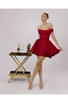 A mesmerizing ruby red dress, short in length, exuding pure elegance. Designed with a refined off-shoulder neckline and crafted from luxurious taffeta fabric, this haute couture creation embodies timeless luxury.