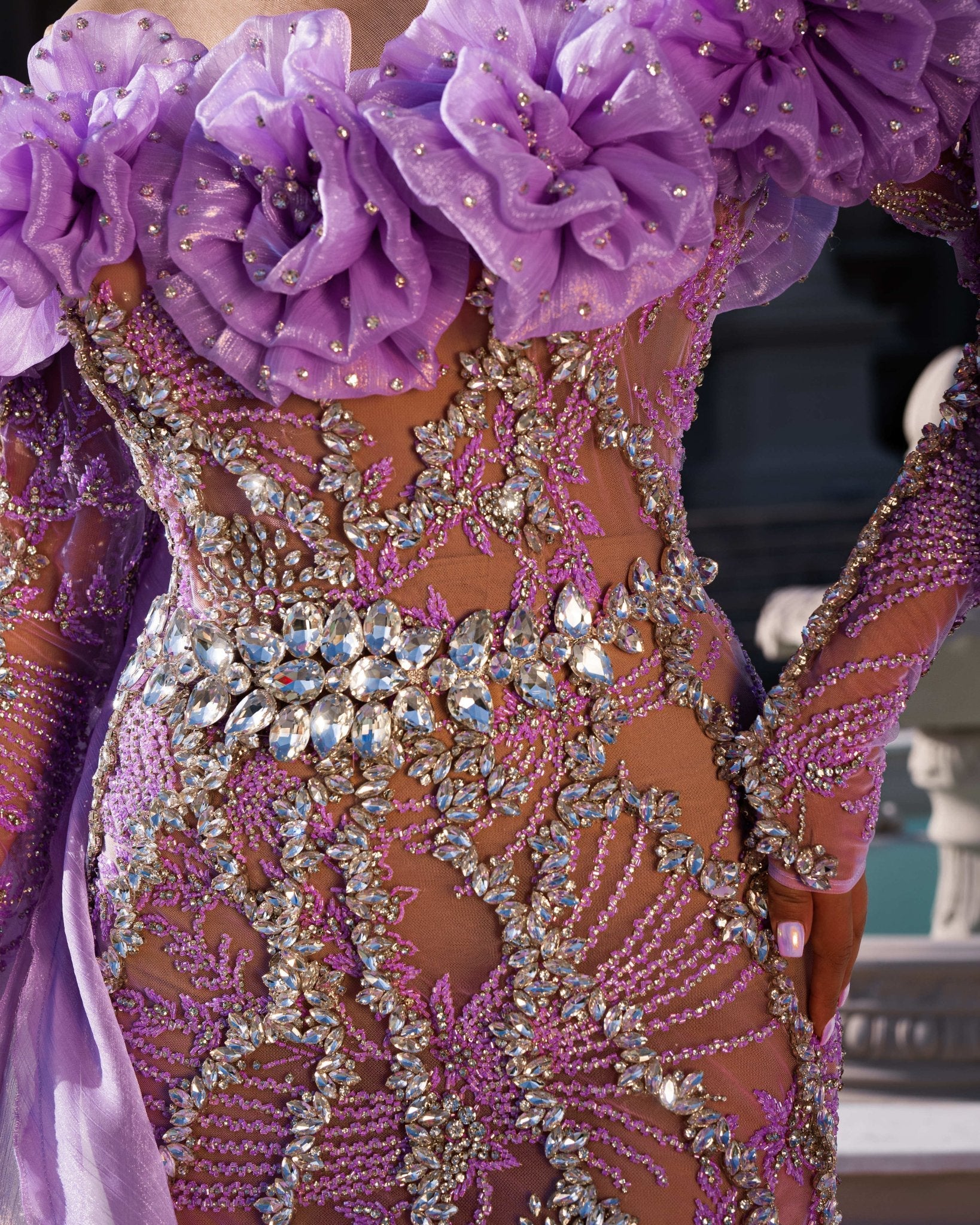Adding to the dress's allure, we fashioned the side capes from delicate purple organdy fabric. They gracefully drape from the shoulders, cascading down to create an ethereal effect as you walk. Around the bust, we added additional accents of organdy purple fabric, enhancing the overall design and adding a whimsical touch.