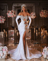 Furthermore, the off-the-shoulder design delicately frames your collarbones, adding a touch of romance and allure to your bridal dress. Long sleeves seamlessly blend into gloves, creating a harmonious silhouette that exudes refinement and sophistication.