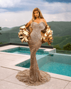 Ideal for a high-fashion gala, award ceremony, or editorial shoot, this look is the epitome of luxury and bold femininity. With every sparkle and shimmer, the gown exudes confidence, sophistication, and a sense of regal power that refuses to go unnoticed.