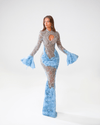 Long fitted sleeves enhance the gown’s sleek profile, while dramatic ruffled cuffs in icy blue introduce movement and a couture-inspired flourish. The waist is beautifully accentuated with sculptural ruched detailing, defining the figure and creating a striking contrast between structure and softness. Flowing down into a floor-length skirt, the gown elongates the body and delivers an unmistakable red-carpet presence.