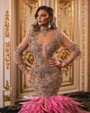 But it's the magnificent design that truly sets this dress apart. From the knee, a breathtaking motif emerges, adorned with feathers in shades of pink, silver, and gold. Like delicate whispers of magic, these feathers dance and sway with every movement, creating a sense of fluidity and grace that enchants the eye and stirs the soul.