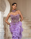 This sleeveless dress in a rich purple color is the epitome of elegance and sophistication. The dress is fully embellished with sparkling stones and crystals that catch the light beautifully, making it perfect for a special occasion or a night out on the town. The dress features a deep slit with a layered tulle design that adds a touch of romance to the overall look. The dress also comes with a matching neck chain that complements the overall design of the dress and adds a touch of glamour. The dress is made of high-quality materials that drapes beautifully on the body, giving it a flattering and feminine silhouette. The purple color is perfect for any skin tone and will make you stand out in a crowd. The crystals and stones used in the dress are of the highest quality, adding a sense of luxury and elegance to the dress. The dress is perfect for a cocktail party, prom, or any other special event. The deep slit and the layered tulle design add a touch of sexiness to the dress, making it perfect for a night out on the town. The dress is sure to turn heads and make you feel like a star.