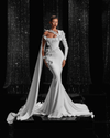 This ethereal ball gown is a stunning celebration of grandeur and femininity. The voluminous skirt sweeps the floor with architectural precision, cascading in structured folds that emphasize its regal silhouette. Crafted from luxurious white satin, the dress features an off-the-shoulder neckline adorned with oversized 3D floral appliqués, each petal delicately shaped to add dimension and whimsy. The fitted bodice cinches at the waist, contrasting dramatically with the expansive skirt, while soft embellishments trail organically down the fabric like a blooming garden. The dramatic train adds theatrical elegance, making it perfect for a couture runway or fantasy wedding.