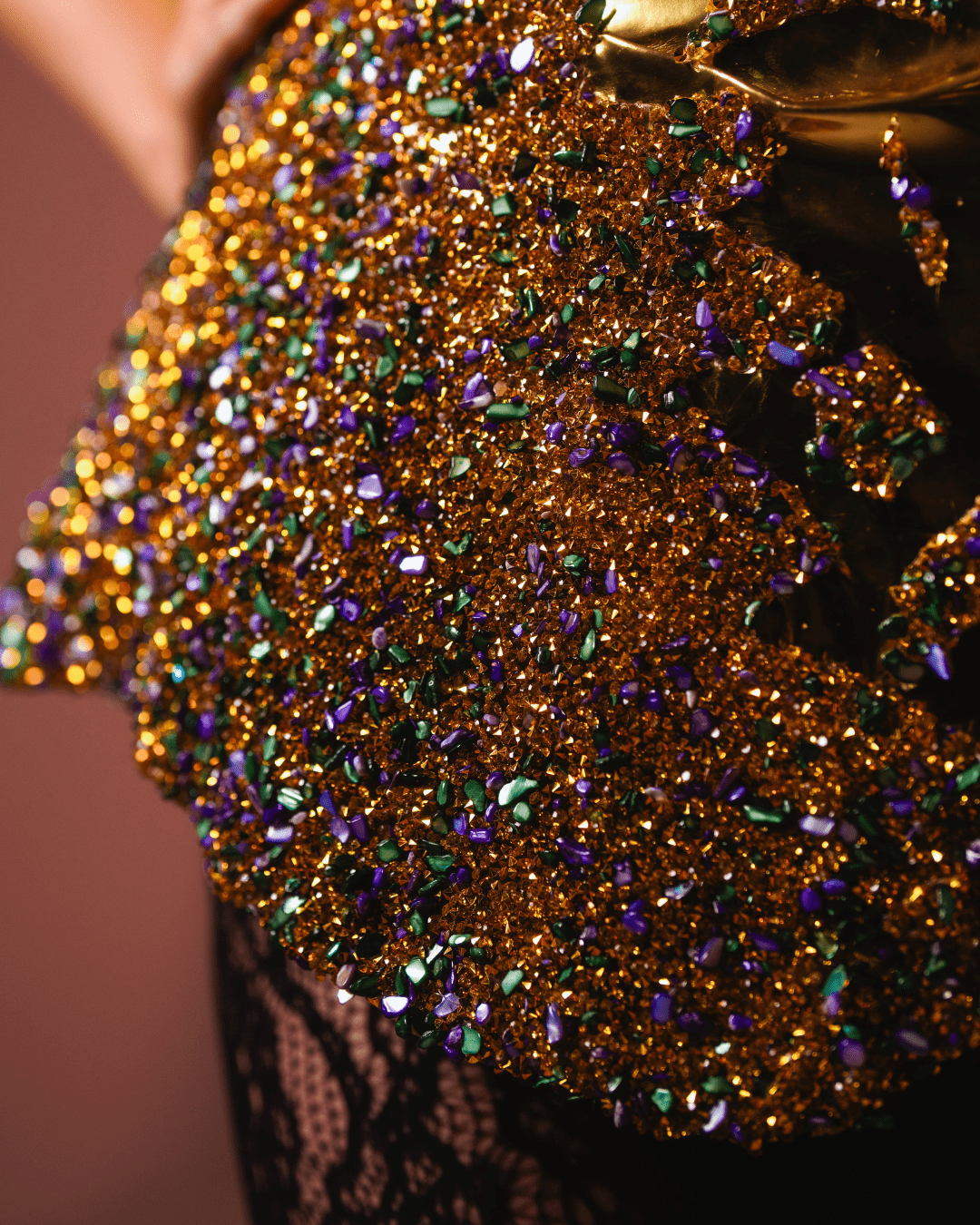 The lower portion of the corset transitions into an exquisite layer of multi-colored glitter embellishments, creating a dynamic contrast between sleek metal and textured sparkle. These sparkling details cascade organically across the hips, forming a visually captivating pattern that adds depth and movement to the piece. The combination of gold brilliance and iridescent glitter makes the corset ideal for high-fashion photoshoots, runway looks, or glamorous evening events.