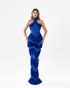 This elegant floor-length gown is the embodiment of timeless glamour and refined sophistication. Designed in a captivating royal blue tone, this dress features a sleek halter neckline that beautifully frames the shoulders and elongates the silhouette. The fitted bodice flows seamlessly into a sculpted, body-hugging shape, creating a striking and confident presence.