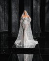 One of the most captivating elements is the dramatic, floor-length veil, crafted from sheer, beaded fabric that cascades effortlessly to the ground. The veil is seamlessly integrated into the gown’s design, enhancing its grandeur and creating an angelic aura.