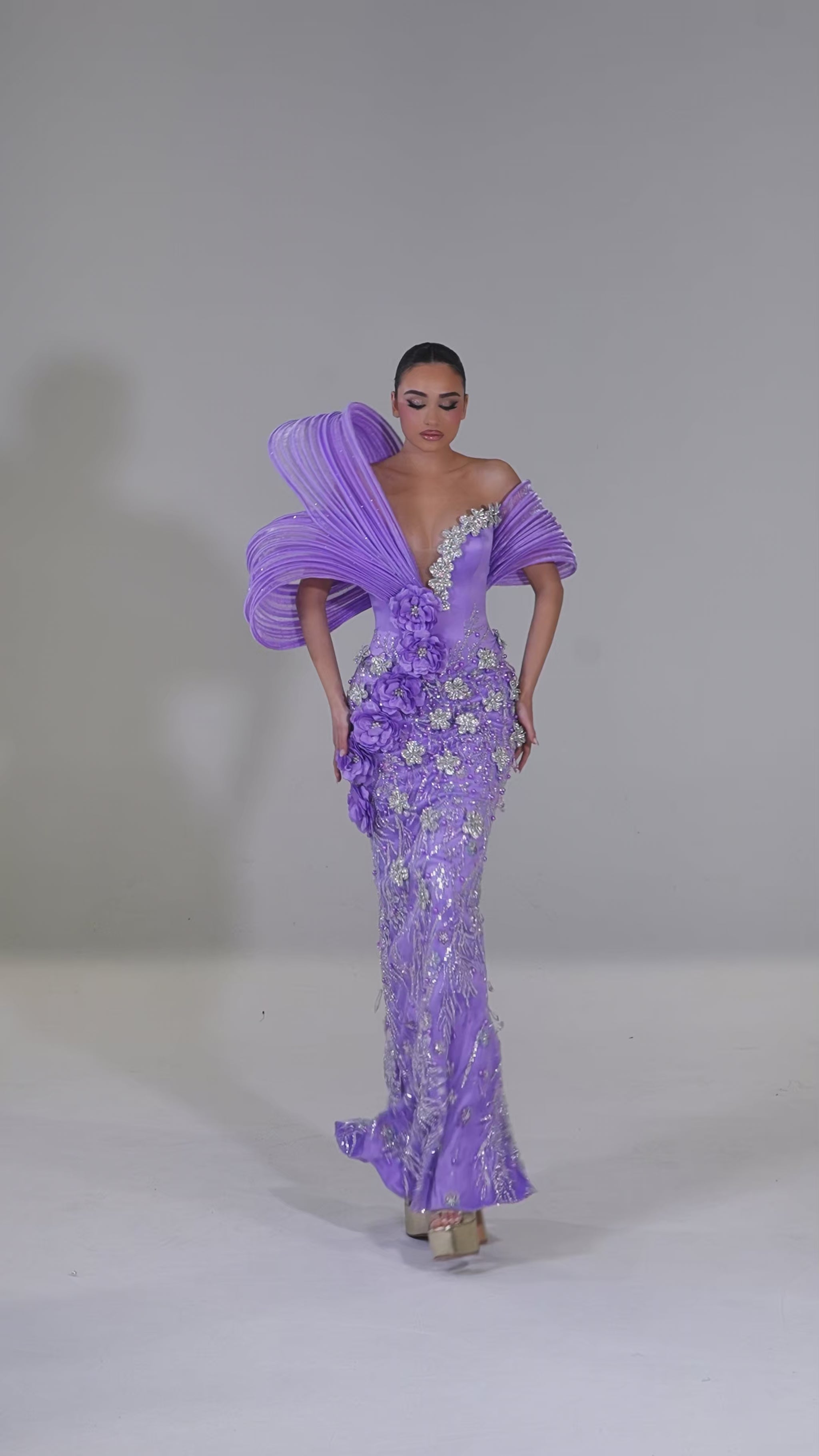 A striking couture silhouette in radiant lavender, this gown features dramatic sculpted shoulders, floral appliqué, and intricate hand embroidery that contours the body with regal elegance. Designed to command attention, it blends modern structure with romantic detail for an unforgettable statement.